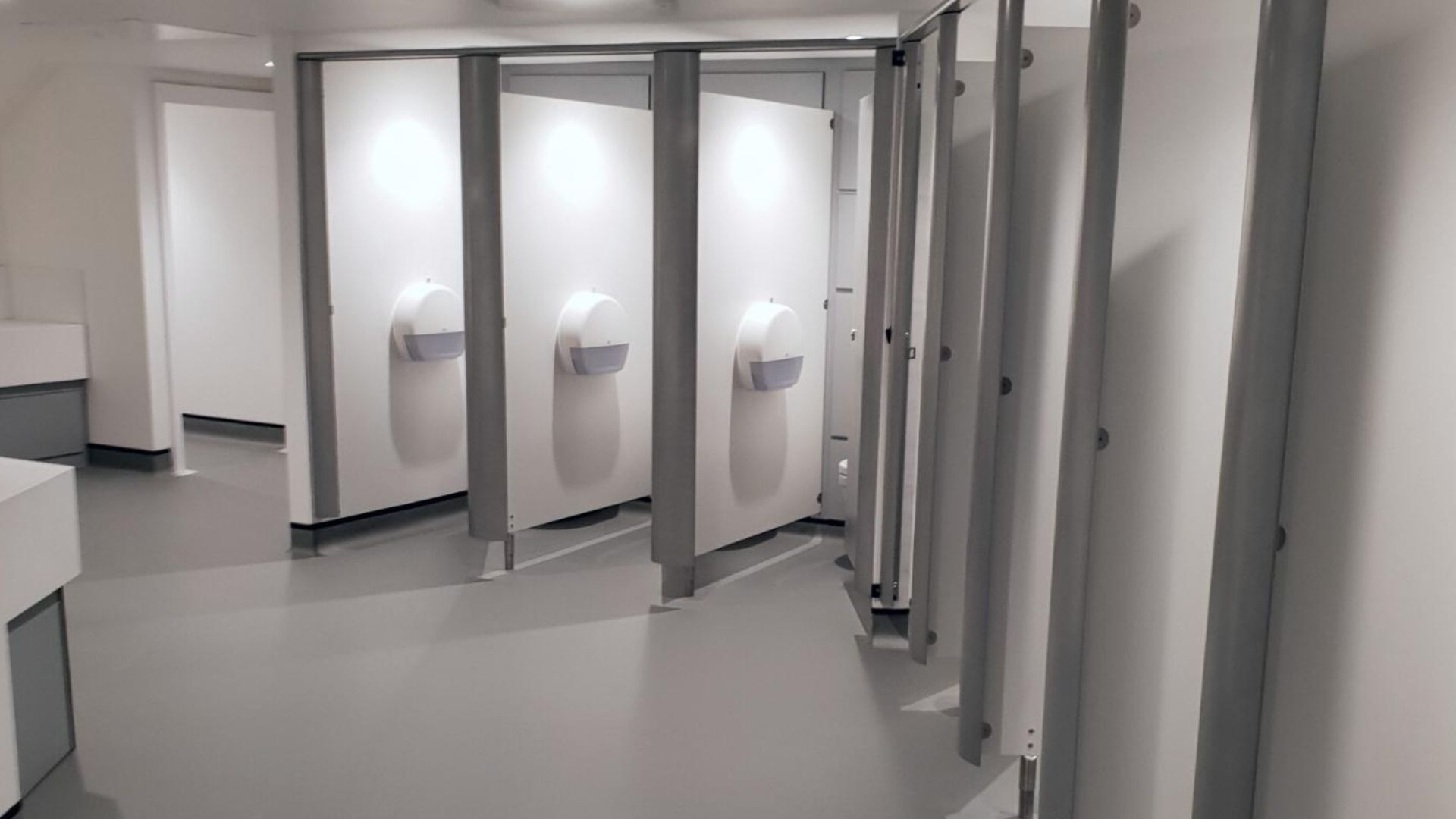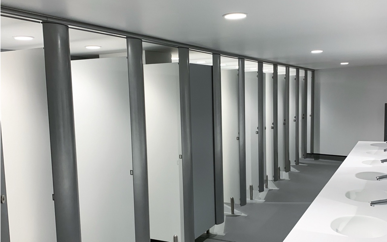 After consulting with AELTCC, we suggested our Curve cubicle range for its rounded, aluminium pilasters to create an elegant yet durable washroom cubicle solution. We upgraded the ironmongery to satin stainless steel for a premium aesthetics to compliment the cool neutral greys (Gris Perle G003) of the laminate duct panels and cubicle partitions.