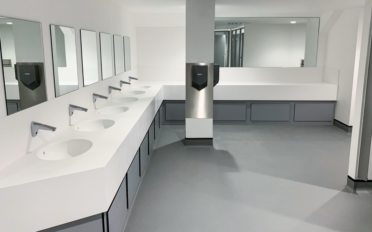 Made from thermoformable and crack resistant Solid Surface, vanity units with under-mounted basins in Glacier White were installed to create a seamless, clean look to the washroom. The final result is an elegant, minimal toilet area that delivered on long lasting durability and aesthetics.