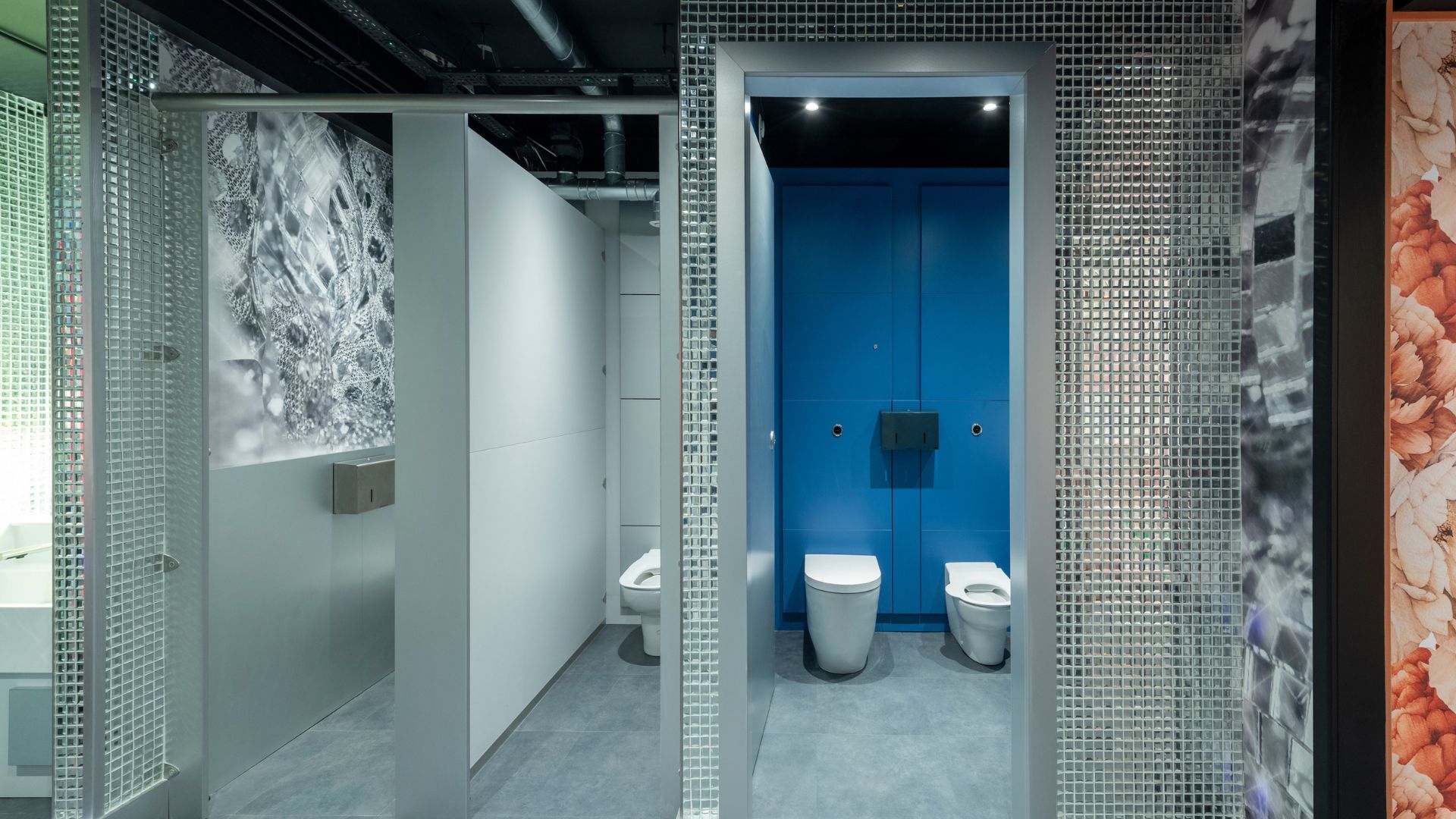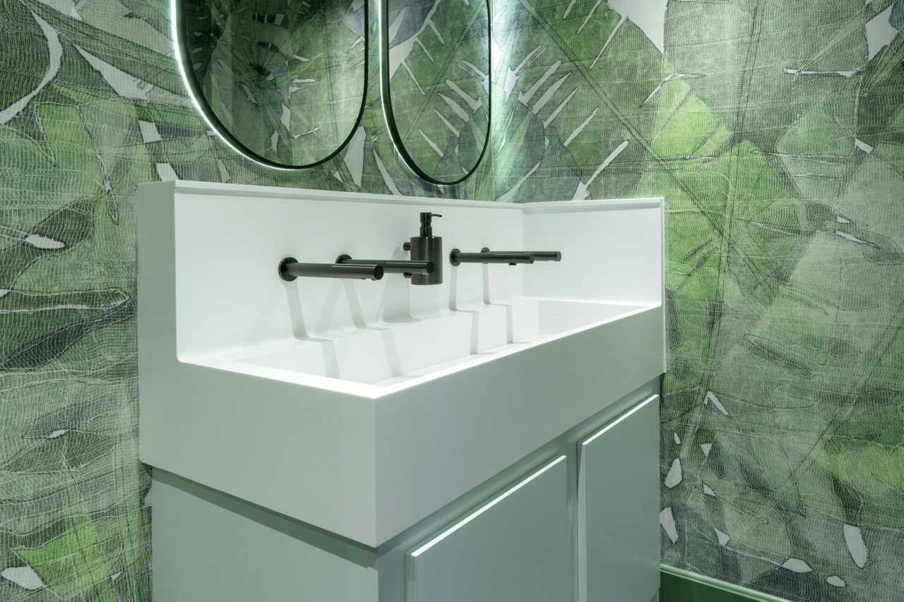 Featuring a jungle-inspired, leafy wallpaper, the male washroom called for something a little more exotic. Epicea (E082) from Polyrey – a rich, earthy green – was chosen to double down on the tropical theme while keeping things playful. To complement the bold palette, glossy black accessories from The Splash Lab were specified, adding a sleek contrast that ties the whole look together.