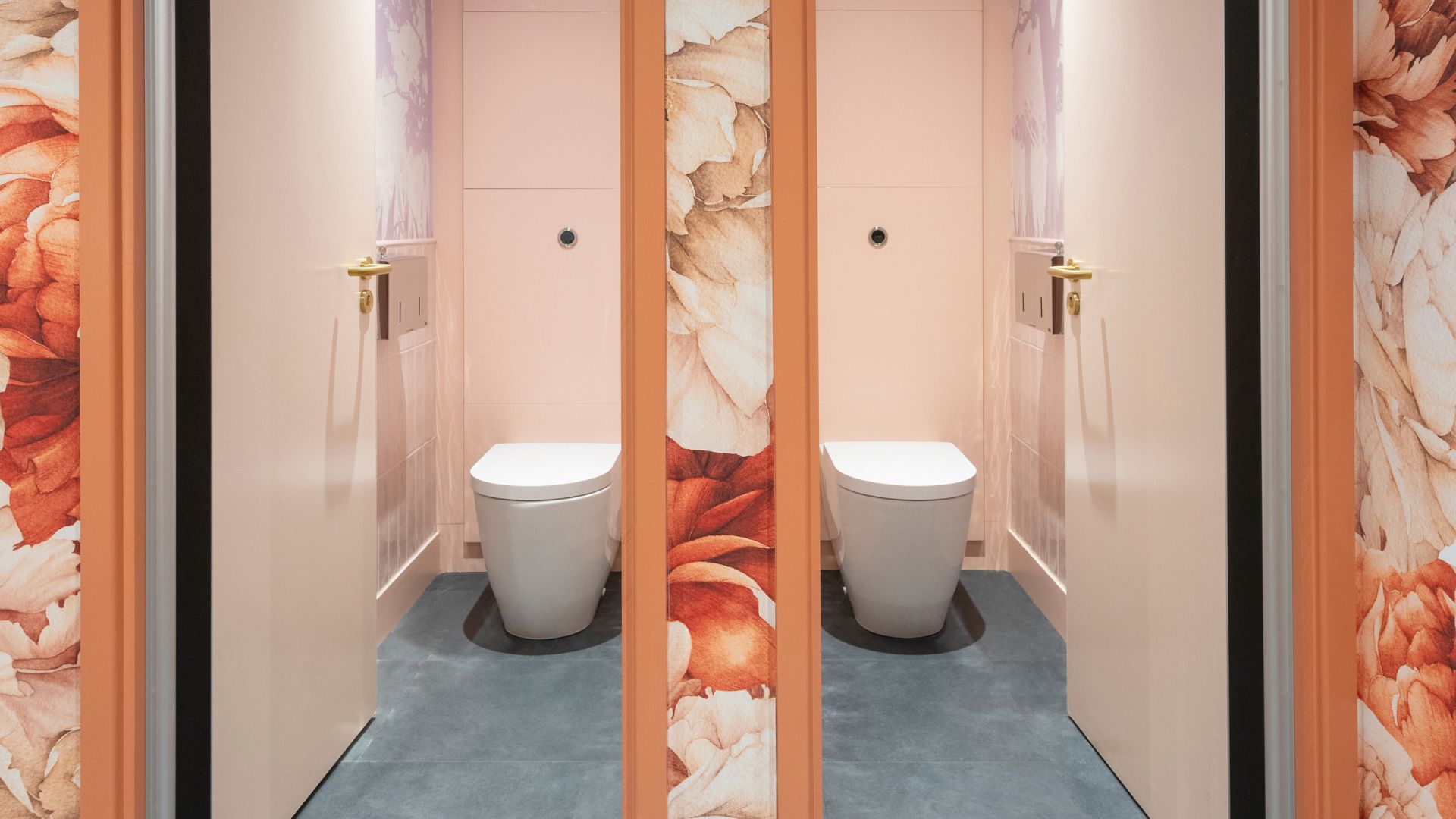Visually, each washroom space had its own design brief, and we worked closely with the client to help them select the right scheme. For the female washroom, which had been draped in a maximalist floral wallpaper, the Force Privacy cubicles and Duct Panels were finished in Rose Givre (R058), supplied by Polyrey. The baby pink colour scheme perfectly offsets the wallpaper, creating a space that is equal parts bold and elegant. To elevate the look even further, the space was completed with premium brass taps, soap dispensers, and hand dryers supplied by our partner The Splash Lab.