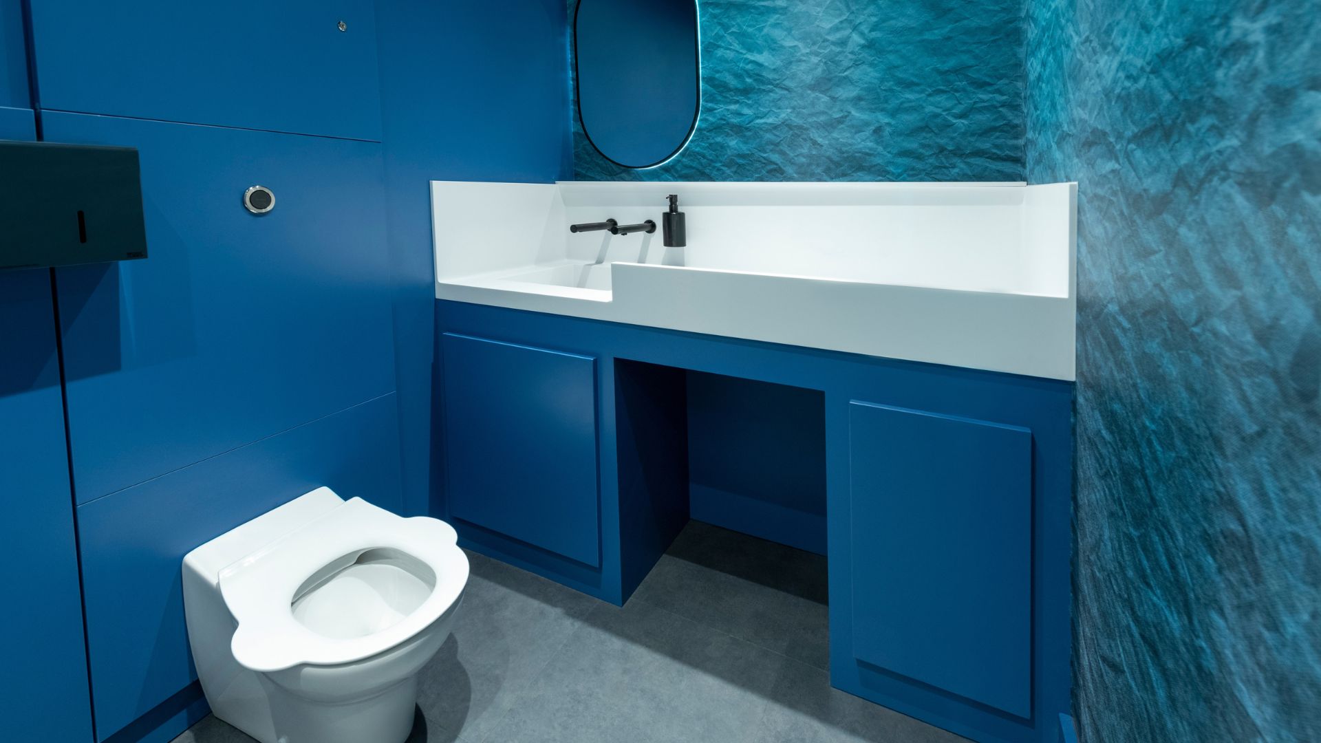 As part of the wider washroom fit-out, a parent and child focused Universal Toilet was kitted out, complete with a Solid Surface Vanity and integrated baby change top. Here, our access panels were selected in aquatic blue Lamar (0023 FH) from Fundermax, which paired perfectly with the crinkle-textured blue wallpaper for an unexpectedly calming and stylish touch.