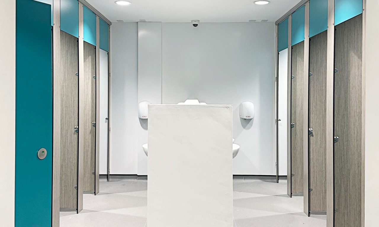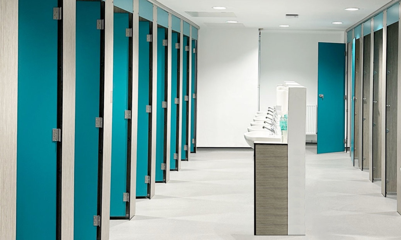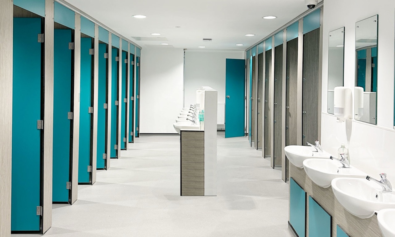 The project involved a comprehensive refurbishment of key washroom areas including: a girls and boys toilet block, sports hall washrooms, and dedicated male and female staff toilets. The aim was to modernise and enhance the privacy of these spaces that are in keeping with the school’s colours and design preferences.