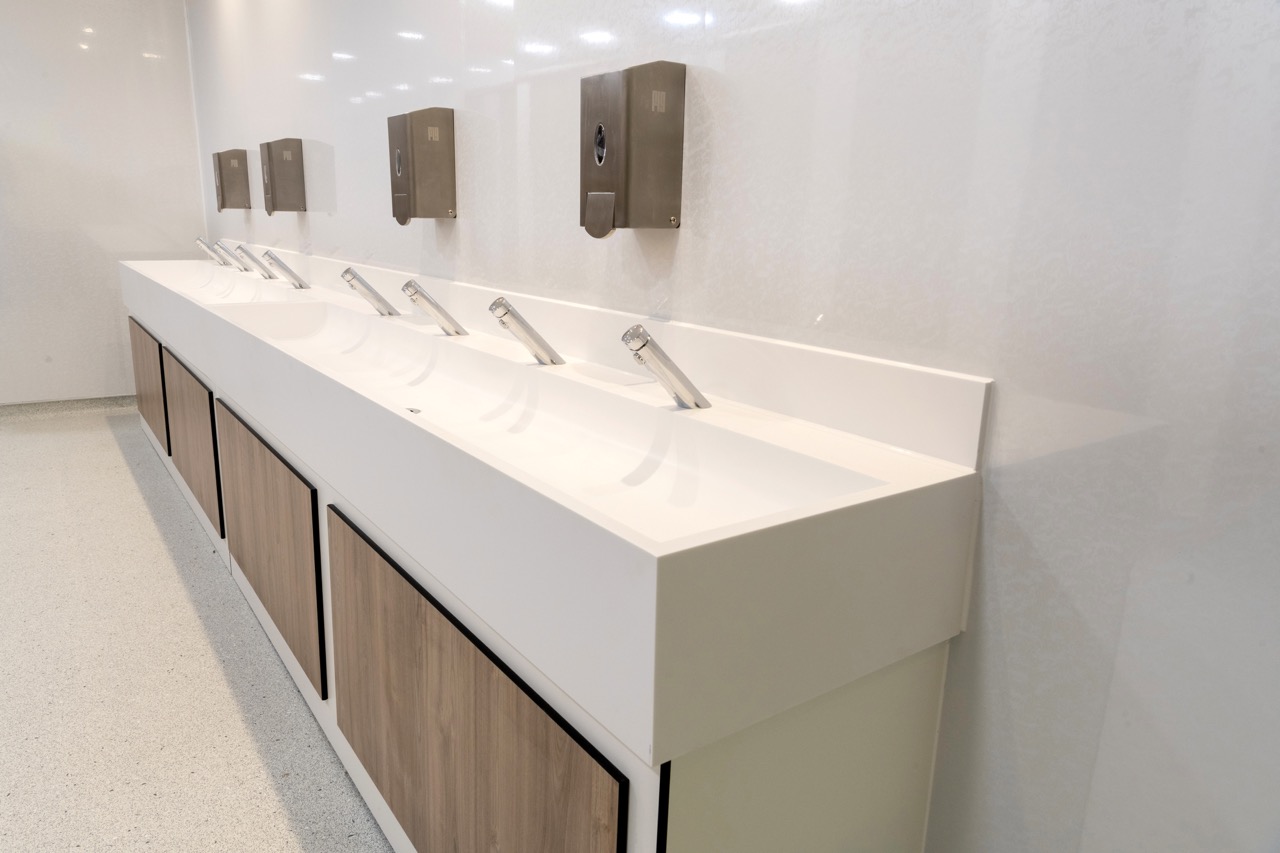 We supplied our sleek curved solid surface wash troughs (WT001) with an exposed waste, uplifting the whole washroom with a contemporary and minimalist aesthetic. Crafted from durable Corian, the troughs are built with longevity in mind, and are preferred within schools due to its ability to accommodate multiple users at once.