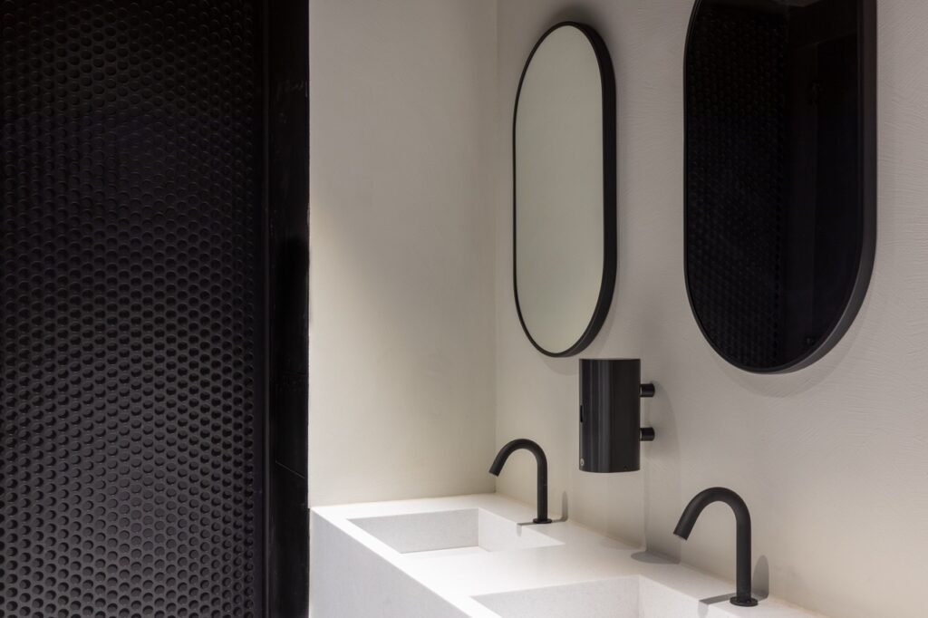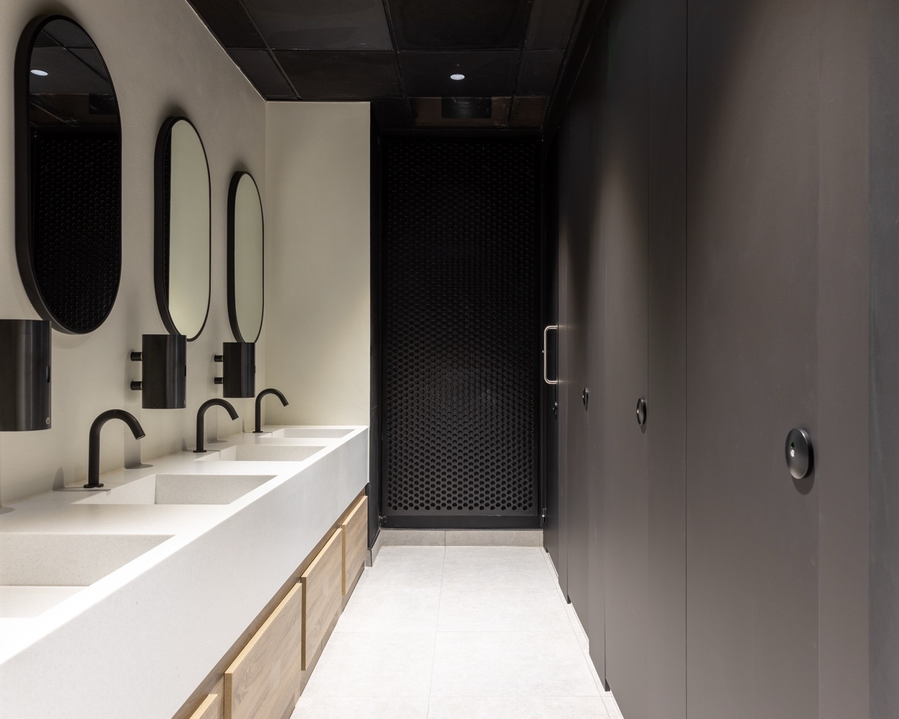 Complementing this, the Duct Panel System and Vanity Fascias, also in Pfleiderer Grey Sonoma Oak, deliver a consistent and professional appearance throughout the washrooms. Our Solid Surface Vanity Units in Durasein Silver Falls provide a crisp white counterpoint to the darker cubicles, with matt black ironmongery, taps, and soap dispensers complementing Amron’s matt black panels, tying the design scheme together.